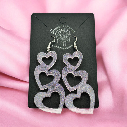 Handmade Triple Pink Glitter Hearts Dangle Earrings