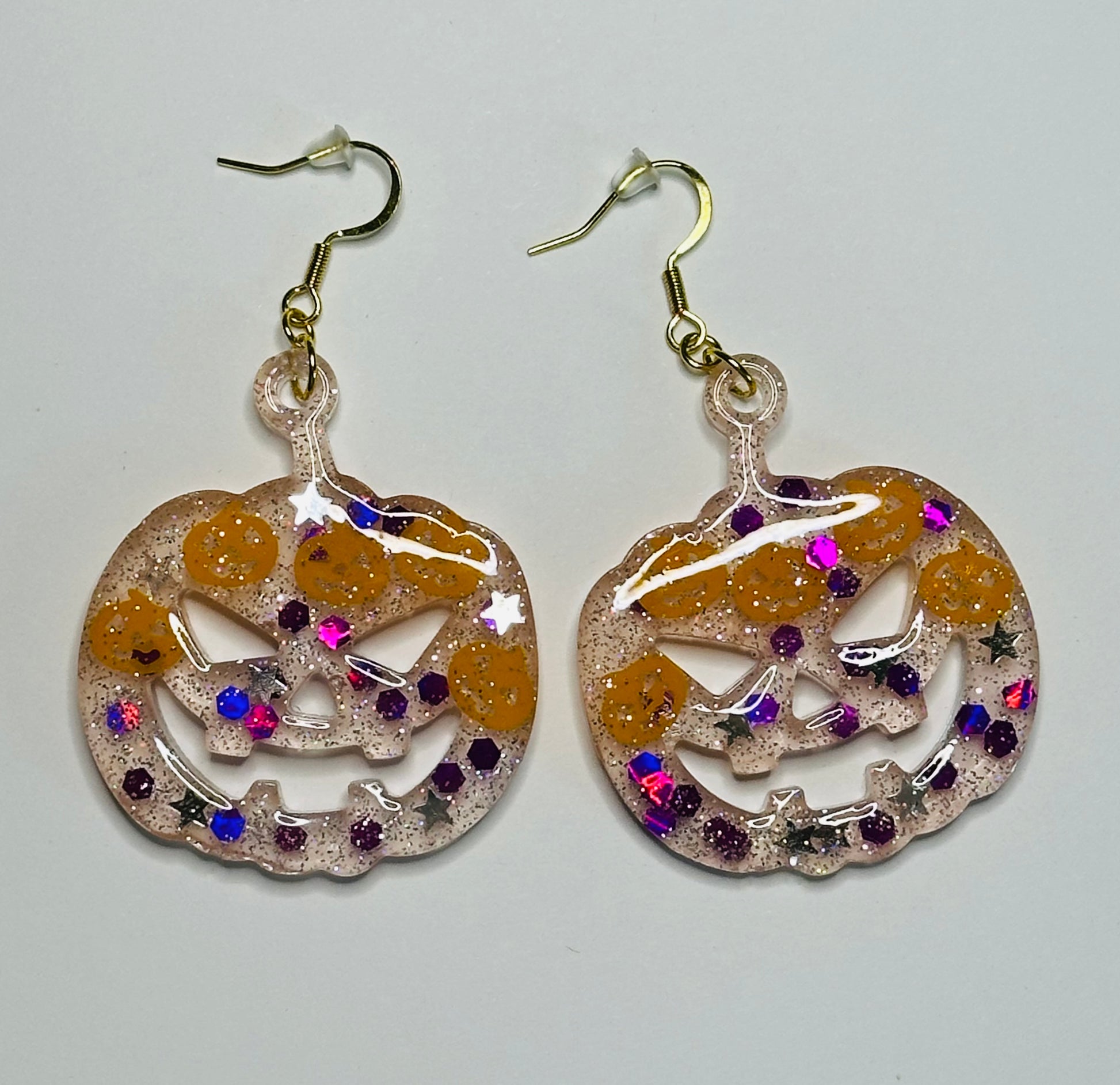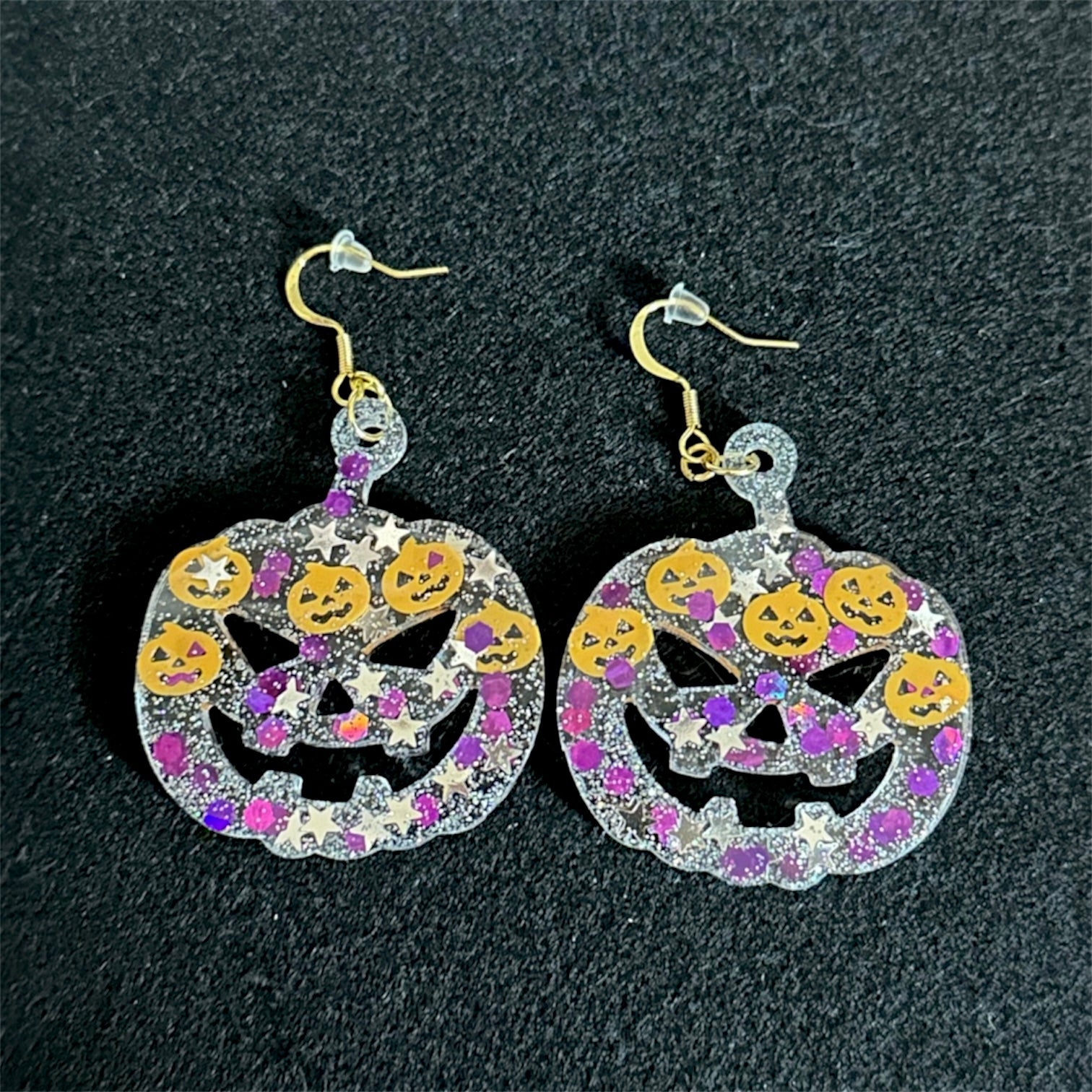 Add some spooky sparkle to your style with these one-of-a-kind, handmade Halloween earrings! Shaped like grinning jack-o’-lanterns and sprinkled with silver, purple, and orange glitter plus tiny golden pumpkin details, each pair is a festive statement piece.